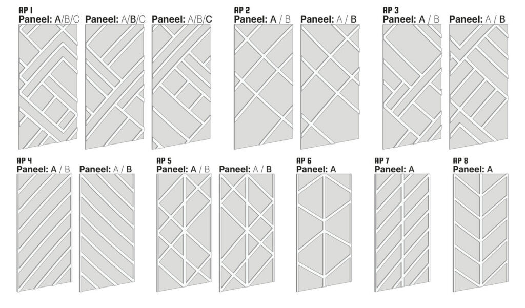 Keuze uit 8 verschillende patronen, waarbij binnen hetzelfde patroon paneel A doorloopt en aansluit op paneel B (en bij patroon AP1 zelfs paneel C aansluit op B).