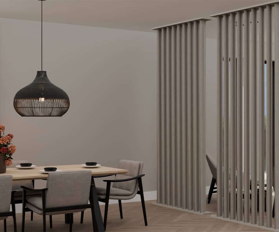 Doordat de lamellen gemaakt zijn van PET-vilt heeft het uitstekende akoestische eigenschappen. Kortom, de lamellen scheidingswand is zowel stijlvol als akoestisch.