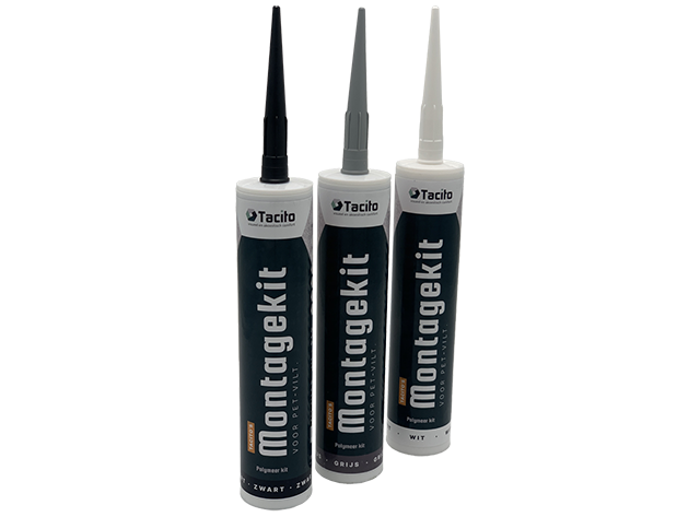 Voor de montage van PET-vilt gebruiken wij hoogwaardige Tacito’s Montagekit. Onze kit is verkrijgbaar in 3 kleuren: wit, grijs en zwart. Je kunt de montagekit meteen bij het betreffende product bestellen, maar ook apart aanschaffen.