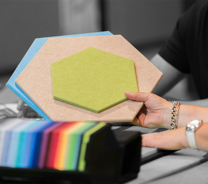 Met de maatwerk opties van akoestische PET-vilt producten kun je eindeloos mixen en matchen. Kies uit 48 kleuren, diverse oppervlakken en unieke prints. Creëer gepersonaliseerde oplossingen die perfect passen bij elk kantoor interieur, of het nu gaat om wandpanelen, plafonddecoratie of scheidingswanden.